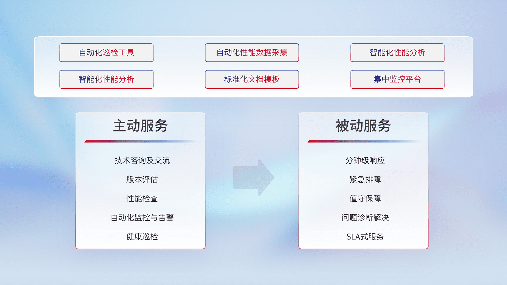 智能化工具和标准化文档,,,保障服务质量,,提供主动服务(包含技术咨询、、、、版本评估、、、、性能检查、、、、自动化监控与告警、、健康巡检)和被动服务包含(分钟级响应、、紧急排障、、、值守保障、、、、问题诊断解决、、、SLA服务)。。。。